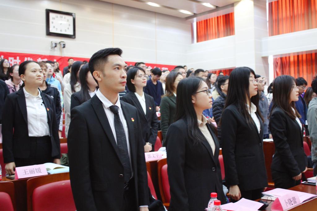 会议以全体奏唱《国际歌》拉开帷幕。随后,大会进行研究生党支部书记联席会换届仪式。由第一届研究生党支部书记联席会秘书长阮志朋作2017-2018学年研究生党建工作述职报告,从“加强组织建设·锻造高素质党员骨干队伍”、“丰富宣教载体·筑牢高质量党建研习阵地”、“抓实常态教育·创设高标准党员培养路径”、“打造特色品牌·培育高水平党建创新项目”进行工作总结。研究生工作部副部长徐振东老师向第二届联席会委员授予聘书,第一届联席会秘书长阮志朋同志、第二届联席会秘书长邢丹同志进行了联席会会旗交接仪式。