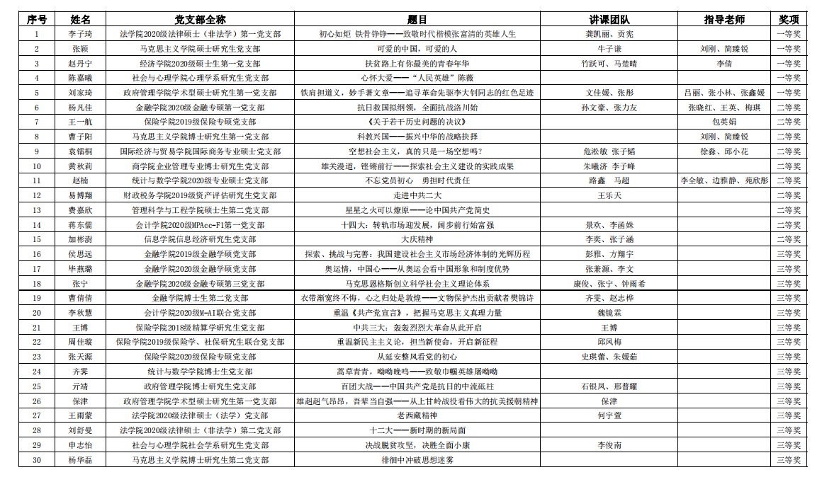 为深入学习贯彻习近平新时代中国特色社会主义思想,迎接中国共产党百年华诞,大力推进研究生党员骨干队伍建设,学校于2021年3月正式启动红旌工程“百场党课悟初心”研究生党支部书记微党课大赛。本次大赛共设122个题目,最终收到115份微党课视频作品。经过审核评价和线下决赛两个阶段的评审,最终评出一等奖5名、二等奖10名、三等奖15名,具体公示如下: