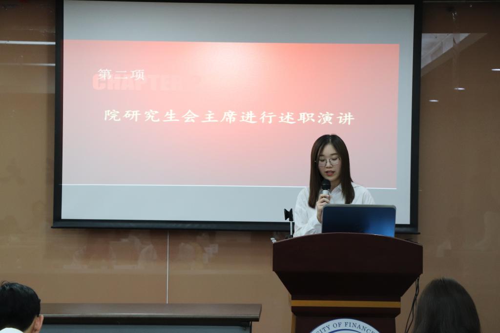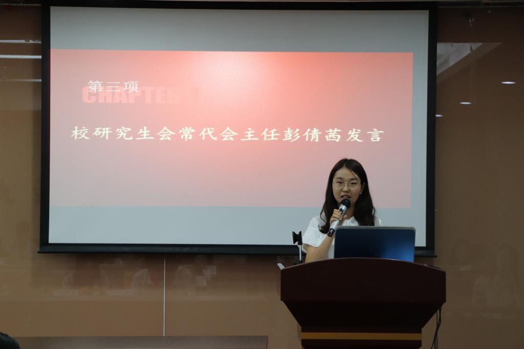 17个学院全部述职完毕后,常代会主任彭倩茜上台发言。她首先对各学院研会一年来的工作给予了充分肯定,院研会和校研会的各项活动充分体现了为在校全体研究生提供服务这一宗旨。同时,本学年基于校研会开展的品牌活动,院校联动方面也有所加强,院校研会之间相互交流借鉴,共同进步。最后,彭主任对研会未来的发展提出更多期望与设想,希望新一届的院研会和校研会能够继往开来,再创辉煌!