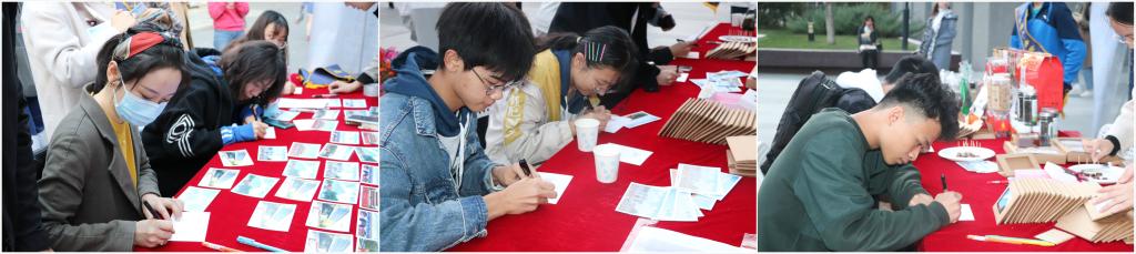 在活动筹备的过程中,项目中心成员提前拍摄了我校的标志性地点,并前往北京具有代表性的名胜古迹打卡,定制出一版精美的原创明信片。活动当天,同学们在体验宕昌好物的同时纷纷积极在明信片上写下对宕昌学子的寄语,以文字的形式传达自己的祝福与鼓励,旨在帮助他们了解山外世界,坚定奋斗信念。174张明信片,为中财大学子与哈达铺中学的学生建立起了一对一的沟通桥梁。