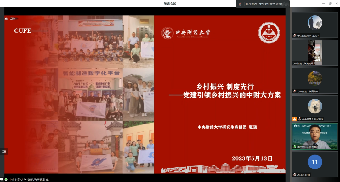 在示范宣讲环节,我校研究生宣讲团与清华大学博士生讲师团、武汉理工大学研究生讲师团、华中师范大学学习习近平新时代中国特色社会主义思想学生研习社、华南理工大学“习语心传”学生党员宣讲团分别主讲。张凯讲师围绕习近平总书记在学习贯彻习近平新时代中国特色社会主义思想主题教育工作会议上的重要讲话精神,以“乡村振兴·制度先行——党建引领乡村振兴的中财大方案”为题进行示范宣讲,结合我校大兴调查研究之风、服务乡村振兴的主题实践,讲述在“党建引领”这一独有制度优势下,山东马坡乡村振兴服务站关于乡村振兴战略中“产业兴旺、生态宜居、治理有效、乡风文明、生活富裕”总要求的实现路径,引导广大青年领会习近平总书记“厚植爱农情怀,练就兴农本领,在乡村振兴的大舞台上建功立业”的殷切嘱托,踔厉奋发,勇毅前行,让青春在以中国式现代化全面推进中华民族伟大复兴的火热实践中绽放绚丽之花。