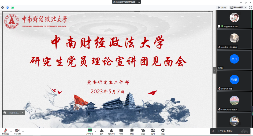 2023年5月7日,我校研究生宣讲团受邀参加中南财经政法大学研究生党员理论宣讲团见面会,与中国人民大学马克思主义学院博士生宣讲团、四川大学百川青年学生宣讲团在云端联合开展宣讲交流活动。