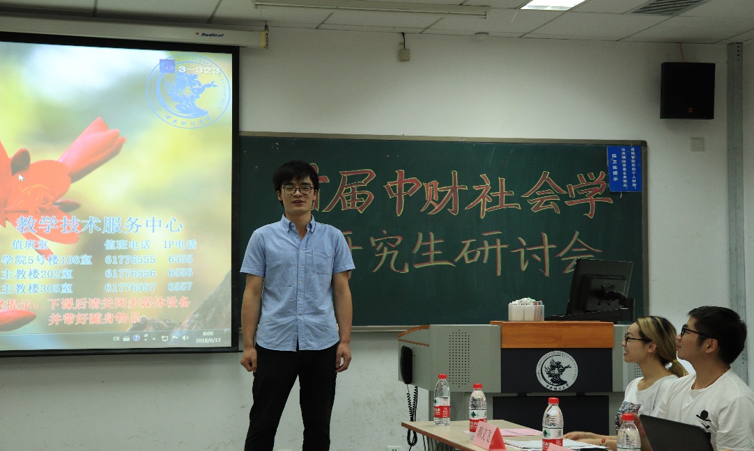 会后,张亚锋同学向社会与心理学院社会学系同学总结了会议交流情况。并于6月13日再次参加社会与心理学院主办的“首届中财社会学系研究生学术研讨会”进行发言。分享了其于海南参会论文和参会过程的所见、所感、所想,同时围绕研究生学术交流问题进行了探讨。