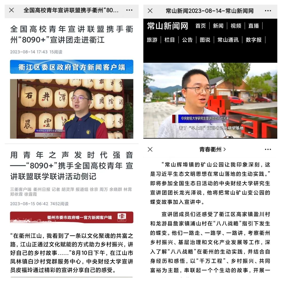 宣讲实践期间,我校研究生宣讲团接受衢江区和常山县媒体视频采访,多次登上衢州市及其下辖县区的官方媒体报道。