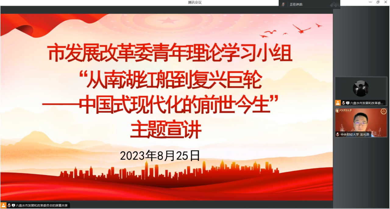 2023年8月25日,为加强青年干部对中国式现代化的理解,六盘水市发展和改革委员会青年理论学习小组邀请我校研究生宣讲团团长龙光泽作题为《从南湖红船到复兴巨轮——“中国式现代化”的前世今生》主题宣讲,市发展改革委青年理论学习小组及全体见习人员30余人参加。