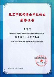 二、获奖者:王霄霄,伟德betvlctor体育金融学院2023届博士毕业生,师从张学勇教授,专业为金融学,博士学位论文为《商业银行附属对共同基金投资行为和业绩的影响》,现工作单位为山东大学。论文的主要创新点为:第一,深化了对新兴市场背景下国有商业银行持股基金公司的经济后果的研究。第二,补充了金融集团持股基金公司这一重要股权安排影响基金行为的新机制,以及挖掘了原有信息机制的新机制。第三,拓展了基金行为的相关研究,研究方法也具有创新性。近年来入选了国家资助博士后研究人员计划,是2023年国家重点研发计划的项目组骨干成员,并获评2024年山东大学优秀博士后一等奖。其一直深耕中国式金融市场发展、中国基金市场研究等重要议题,相关成果发表在《Journal of Banking & Finance》《Journal of International Money and Finance》等金融学领域国际权威期刊。担任《Journal of Economic Behavior & Organization》《International Review of Financial Analysis》《International Review of Economics & Finance》《Journal of International Financial Markets,Institutions & Money》等知名期刊的匿名审稿人。