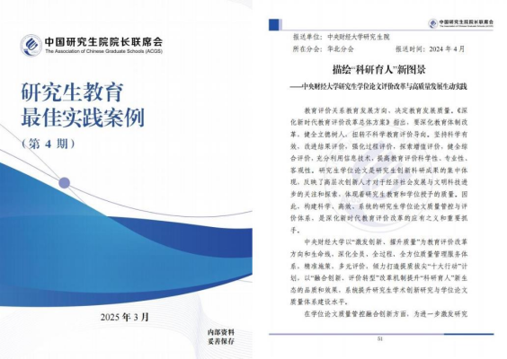 该案例相关内容受到学校研究生教育教学改革研究课题资助,多项研究成果发表在《中国研究生》《高教论坛》《财经高教研究》等学术期刊杂志,系列工作案例被《第二届全国导学思政论坛高校工作案例》收录,被新华网、中国网、学习强国平台等中央重点媒体发表报道,推动一系列学位工作制度更新实施,产生了一定的示范引领和社会影响力,已经形成了“理论课题研究-实践案例应用-政策创新发展”的多元一体化工作格局。