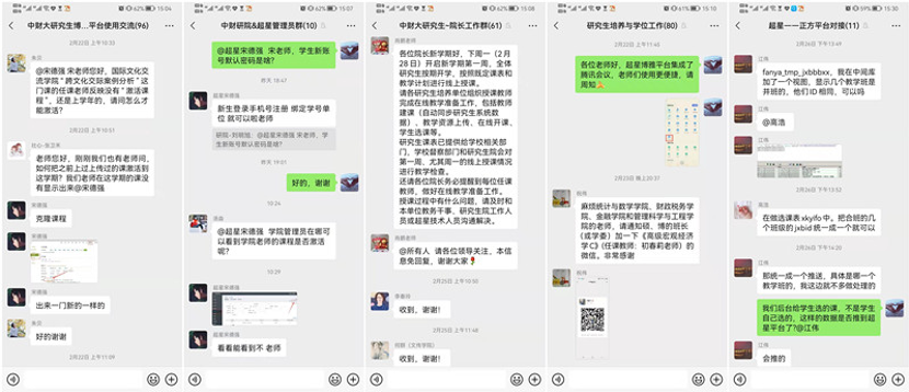 伟德betvlctor体育培养办工作人员、各学院研究生教务秘书、超星和正方技术人员联合组建了3个在线教学交流群,实时提供在线技术支持,全力保障网络教学顺利开展。同时,伟德betvlctor体育通过各个微信工作群对接联络各培养单位,积极为师生线上教学进行答疑解惑。