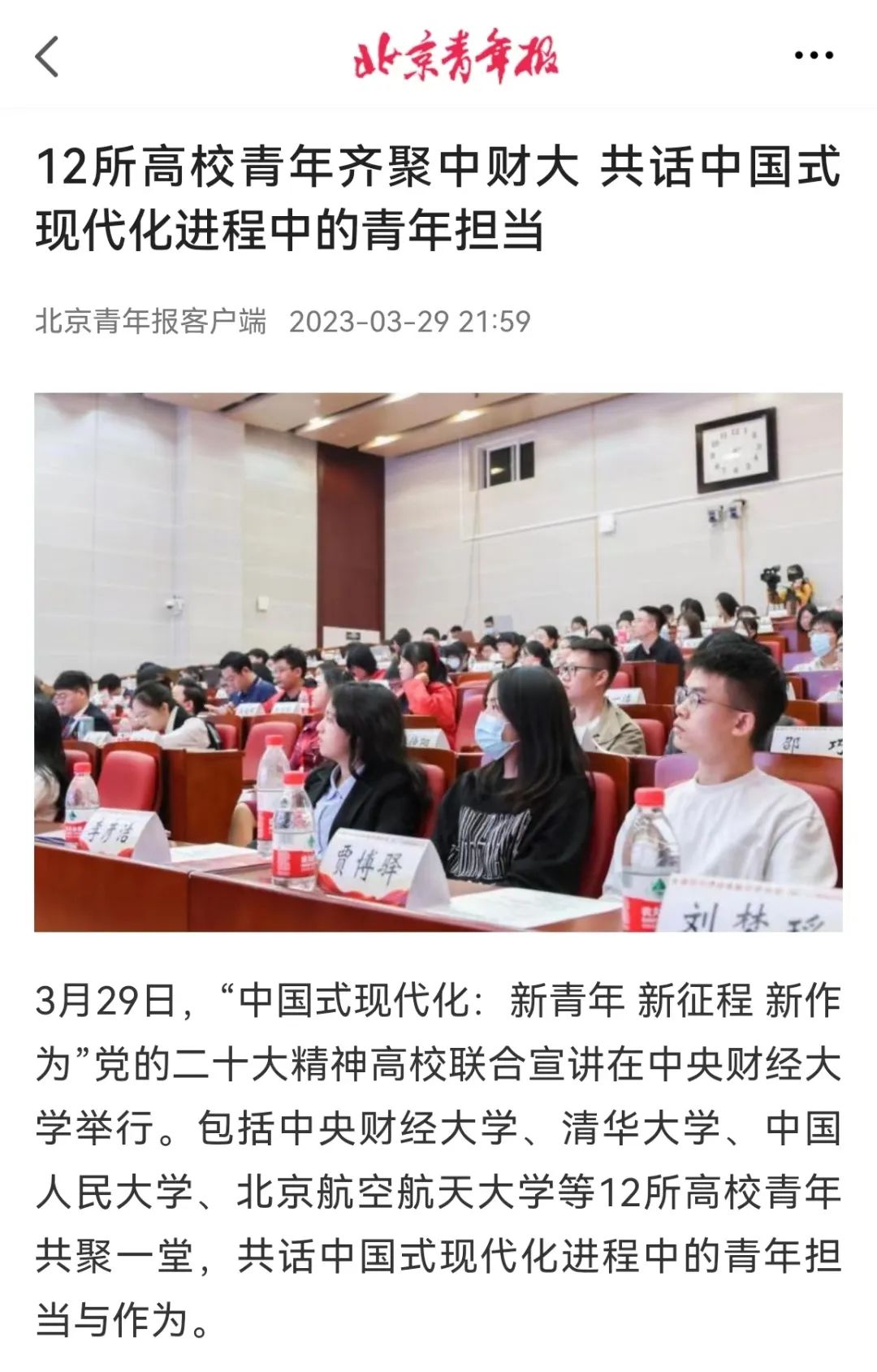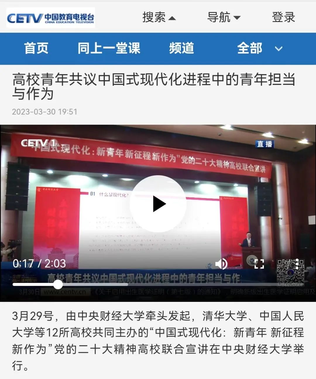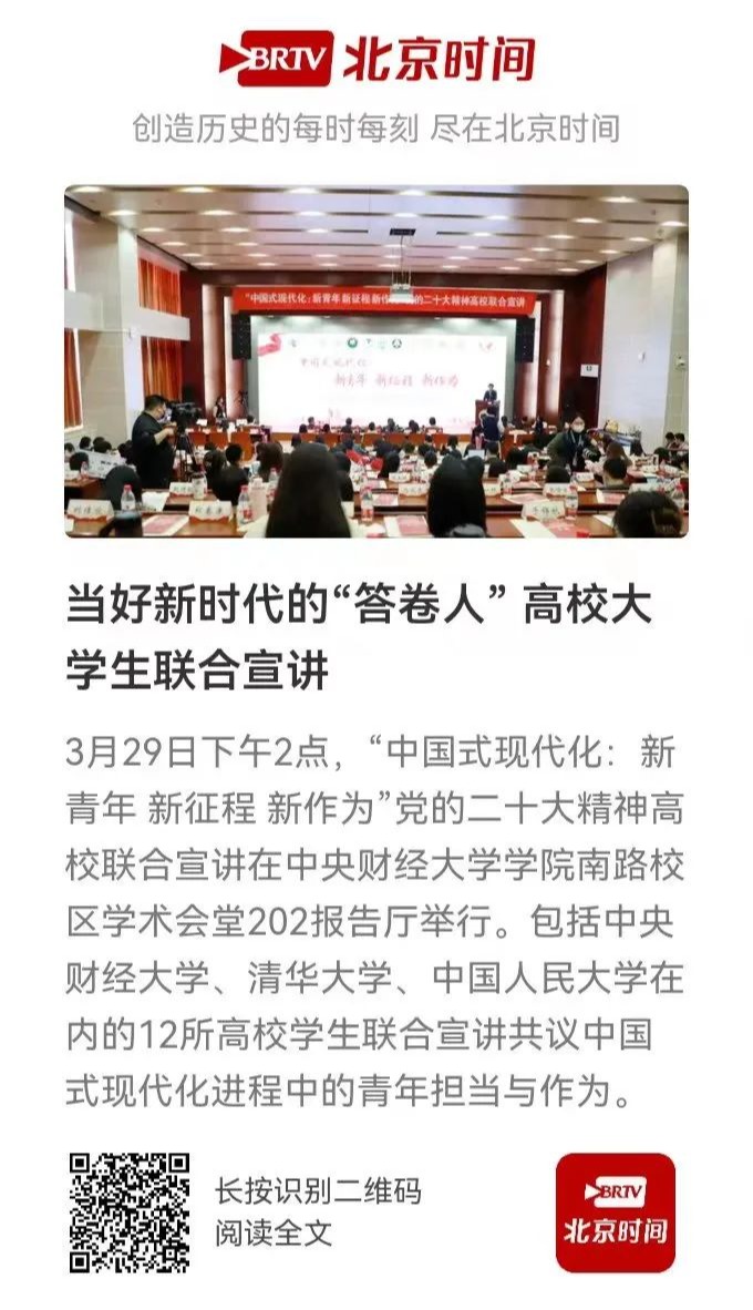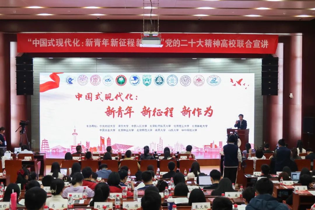 为深入学习宣传贯彻党的二十大精神,引领广大青年深入学习贯彻习近平新时代中国特色社会主义思想,3月29日下午,由伟德betvlctor体育牵头,清华大学、中国人民大学等12所高校共同主办的“中国式现代化:新青年 新征程 新作为”党的二十大精神高校联合宣讲,在伟德betvlctor体育学院南路校区学术会堂202报告厅举行,12所高校的领导、师生代表出席此次宣讲会,伟德betvlctor体育官方微信视频号同步直播,近8000人线上观看,新华社、光明日报等多家主流媒体进行了报道,在各大高校学子中掀起广泛热议。