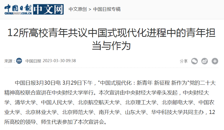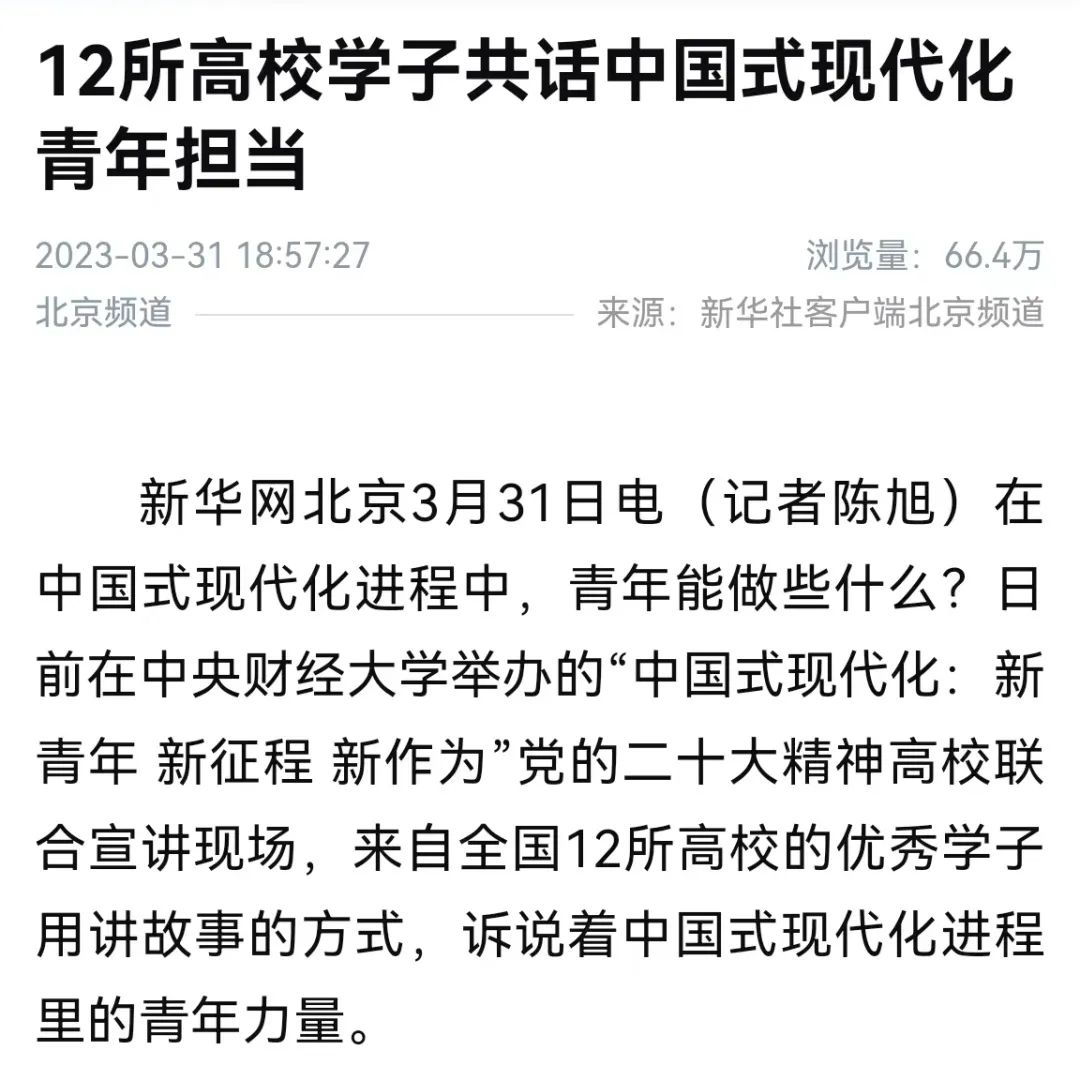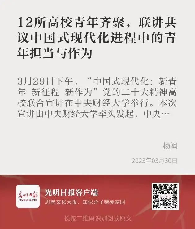 通过宣讲引导广大青年学子深入学习贯彻落实党的二十大精神,充分认识中国式现代化的重大意义,对我们深入理解中国式现代化的内涵和本质要求,深入理解整体推进中国特色社会主义事业、系统谋划全面建设社会主义现代化国家的战略考量,进而将思想和行动统一到全面建设社会主义现代化国家、以中国式现代化全面推进中华民族伟大复兴上来,大有帮助。12所高校的青年之声,传递着青春力量,我们广大青年学子更要坚定不移听党话、跟党走,做有理想、敢担当、能吃苦、肯奋斗的新时代好青年,让青春在全面建设社会主义现代化国家的火热实践中绽放绚丽之花。