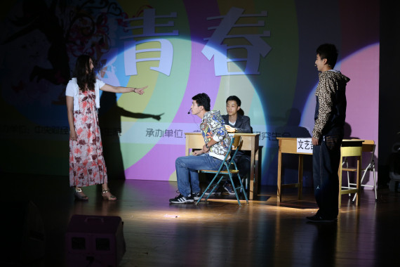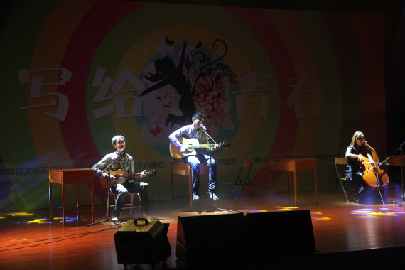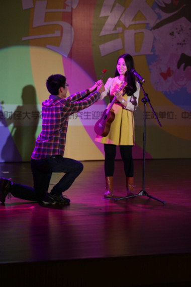 第二个篇章是“写给中财”。首先是校友合唱团带来的歌曲联唱,到场的校友已然银发,但却精神焕发,歌声优美,观众们无不为他们所感动与吸引。器乐表演节目《鼓韵中财》恢弘庞大,让观众领略到了中财民乐团的磅礴气势。独唱《海芋恋》,歌手与伴舞演员配合默契,现场观众的热情又一次被点燃。随后登场的节目是音乐剧《我们在中财》,六个演员向我们展现了研究生新生的生活,将研究生会招新、迎新晚会等场景刻画地趣味真实,演出过程中笑声连连,观众们不时自发鼓掌。