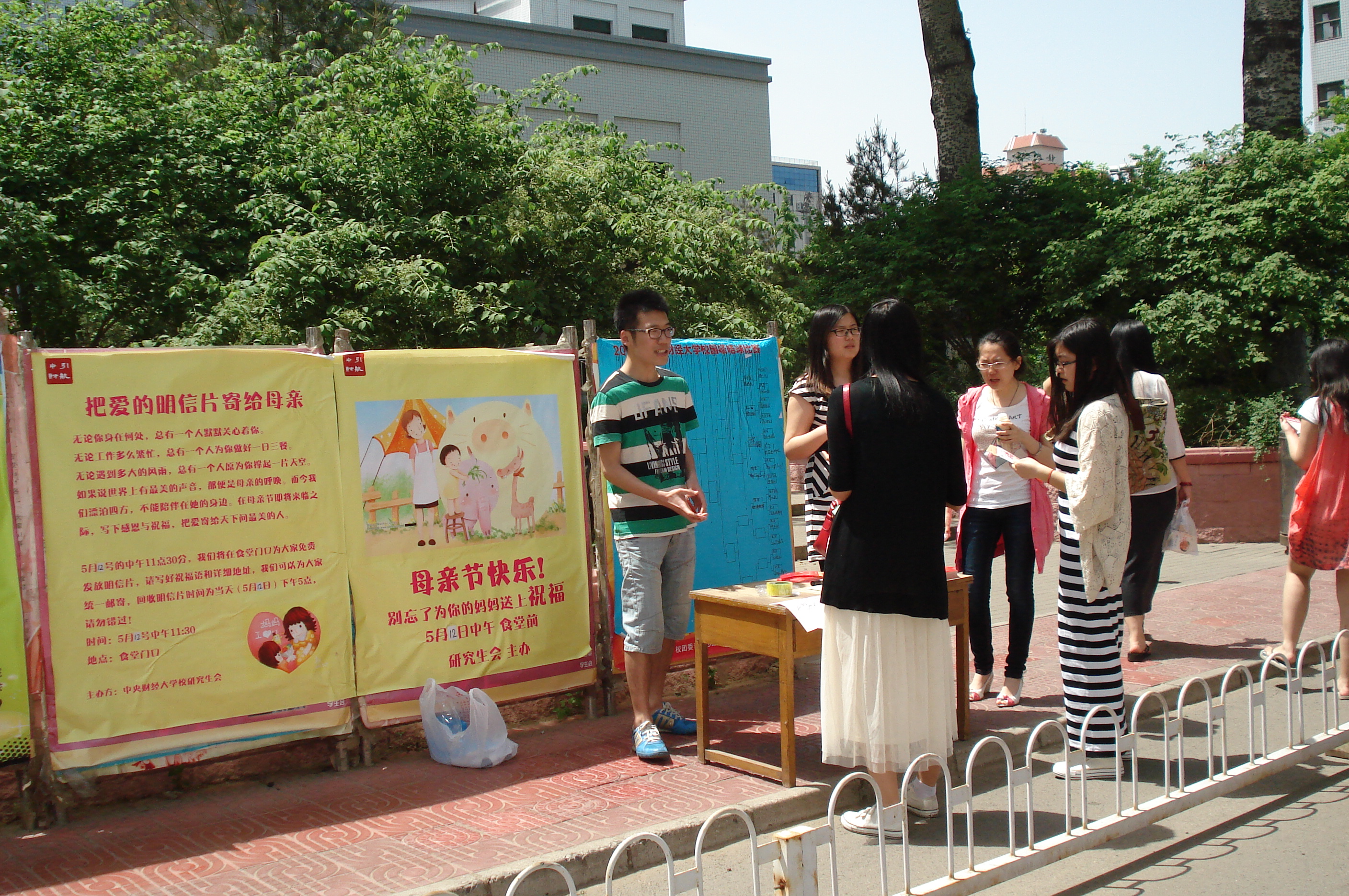 5月12日母亲节当天,“把爱的明信片寄给母亲”活动在学院南路校区食堂门口成功举办,为中财学子的母亲送上子女的祝福。该活动由伟德betvlctor体育、校研究生会主办,校研究生会生活部承办。