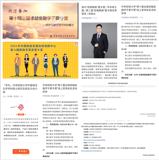 同时,各招生单位也独立开展形式多样的夏令营宣传活动。金融学院、中国财政发展协同创新中心制作了形象生动、活泼风趣的招生宣传视频,金融学院、保险学院、政府管理学院进一步开展本院系夏令营答疑宣讲活动;此外各学院公众号先后推送本院夏令营招生公告,财政税务学院、中国财政发展协同创新中心对往届优秀夏令营员进行推送,文传学院梳理并介绍了本院各硕士研究生招生方向。各学院丰富多角度的宣传工作增强了考生对学院招生专业的理解,进一步提升了对优秀生源的吸引力。