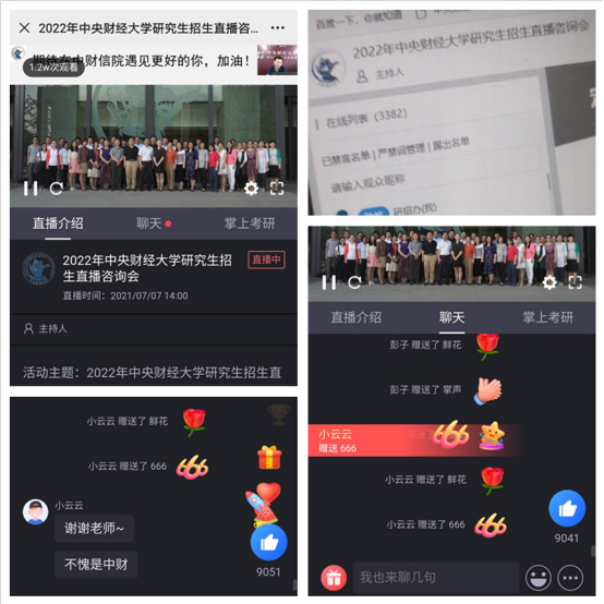 伟德betvlctor体育与部分学院于7月6日、7日开展3场线上招生直播咨询会。伟德betvlctor体育副院长陈运森首先从学校研究生教育特色、培养质量、就业质量、招生政策等方面介绍我校研究生招生、培养、发展情况,随后保险学院、统计与数学学院、财政税务学院、法学院、政府管理学院、商学院、国际经济与贸易学院、信息学院8个学院的宣讲教师分别详细介绍各自学院的研究生培养情况及夏令营招生要求,并与同学们积极互动答疑解惑。三场直播累计观看人次达1.2万人,同时在线人数最高近3400人。