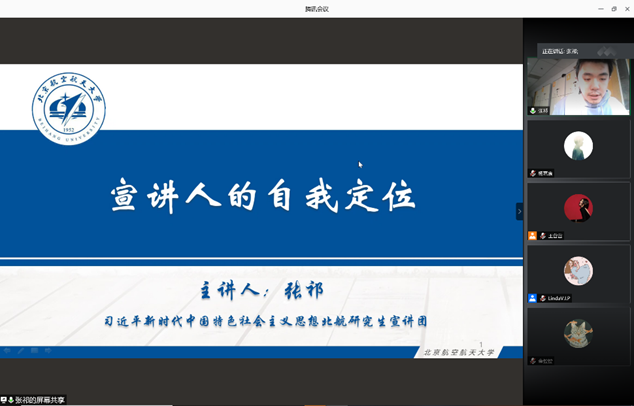 北京航空航天大学张祁团长分享的主题是“宣讲人的自我定位”。首先,他从孔子周游列国的故事出发,带领大家回顾了宣讲的历史,指出宣讲活动是整个国家治理不可缺少的一部分。接下来,他提出宣讲具体发挥的作用在于基于特定的内容为群众讲解理论知识,形成现实认识,达成思想共识,最后树立行动意识。此外,张祁团长向大家讲解了宣讲与授课、报告、演讲等语言活动的共性与差别,说明了宣讲活动的特殊意义,鼓励宣讲团成员把宣讲当成事业,热爱宣讲,享受宣讲。