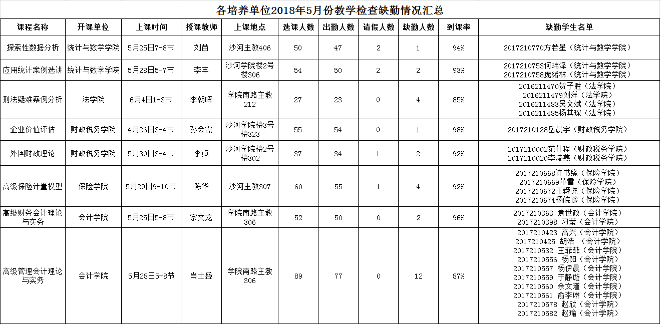 为落实研究生教学常规管理,根据《伟德betvlctor体育研究生教学管理规定》(校发﹝2017﹞159号)、《关于实施研究生教学检查与现场听课月报制度的通知》(研字〔2017〕69号),我校于2017年10月份正式实施研究生教学检查与现场听课月报制度,现将2018年5月份各单位上报教学检查缺勤情况进行通报: