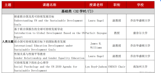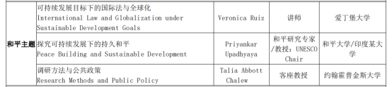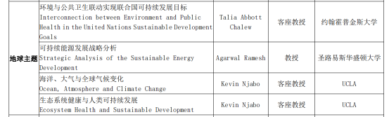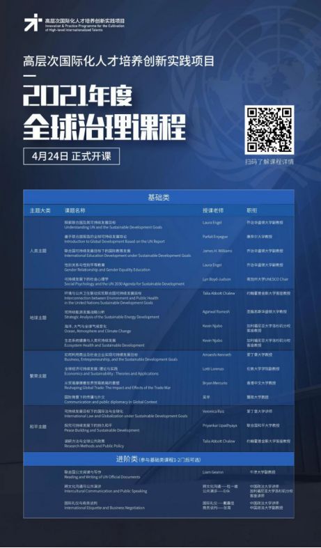 2020-2021学年春季学期全球治理线上课程包括基础类课程和进阶类课程,共19门。其中,基础类课程分为“人类、地球、繁荣、和平”四个主题模块。具体课程名称及授课教师信息如表1所示: