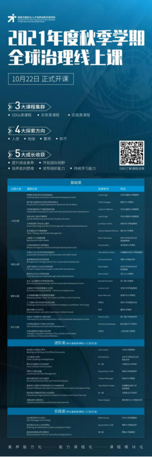 2021-2022学年秋季学期全球治理线上课程包括基础类课程、进阶类、实践类三大类课程,共31门。