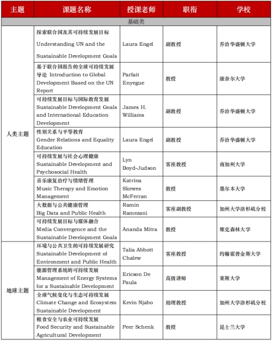 其中,基础类课程分为“人类、地球、繁荣、和平”四个主题模块。具体课程名称及授课教师信息如表1所示: