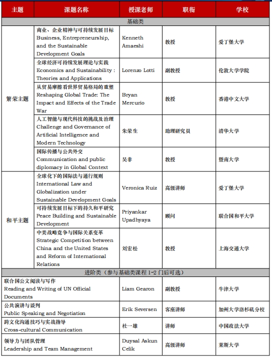 基础类课程由“人类、地球、繁荣、和平”四大主题模块组成,共20门,旨在夯实全球治理基础知识,兼具理论与实用价值,普适性高,所有年级研究生均可选择。