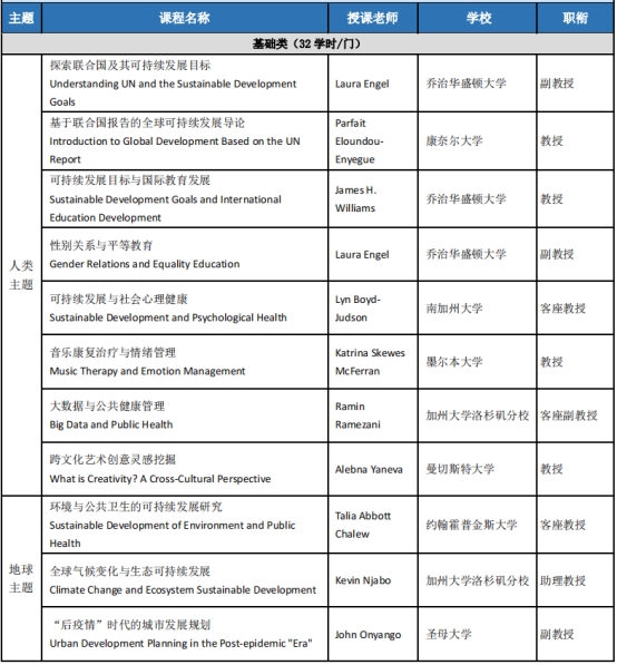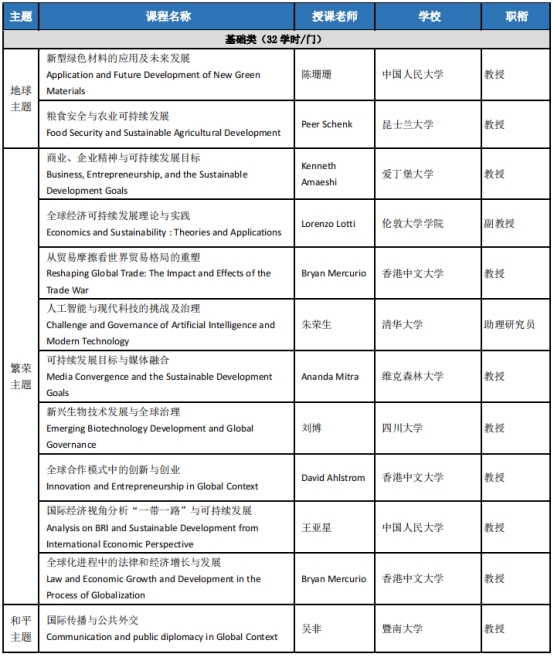 其中,基础类课程分为“人类、地球、繁荣、和平”四个主题模块。具体课程名称及授课教师信息如表1所示: