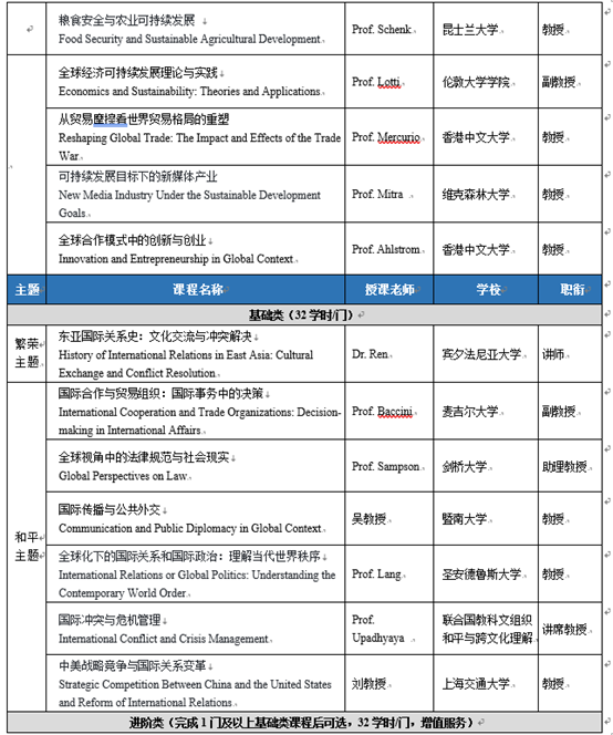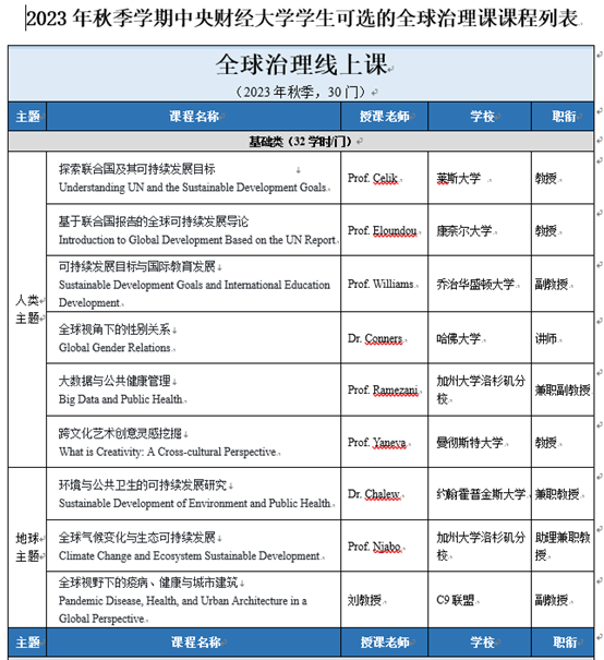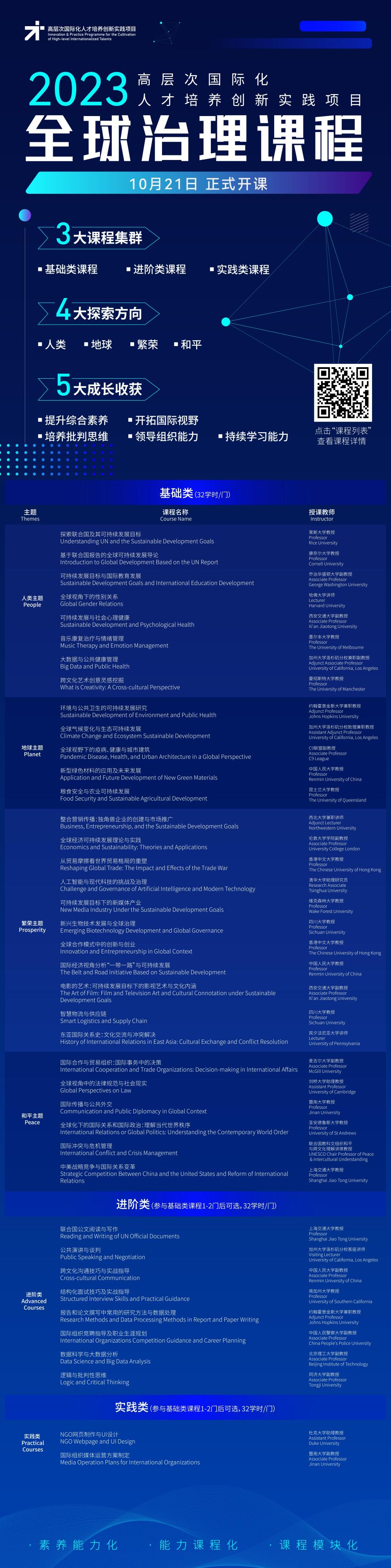 2023-2024学年秋季学期全球治理线上课程包括基础类、进阶类课程、实践类三大类课程,共40门,我校学生可选择其中30门课程(见附件1)。