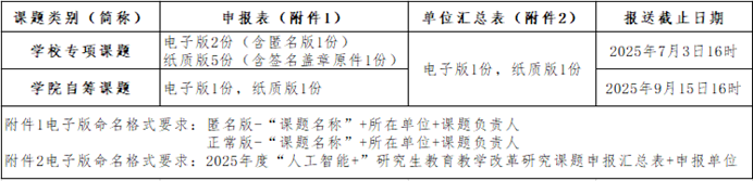 学校专项课题申报材料应于2025年7月3日16时前,由申报人所在单位汇总,与《2025年度“人工智能+”研究生教育教学改革研究课题申报汇总表》(见附件2)一同报送至伟德betvlctor体育培养工作办公室。电子版统一发送至培养办邮箱,邮件主题命名为“学院名称+ 2025年度‘人工智能+’研究生教改课题申报”。