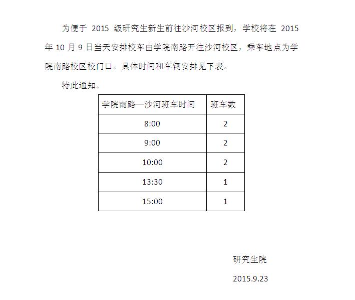 关于2015级研究生迎新日学院南路开往沙河校区迎新专车安排的通知