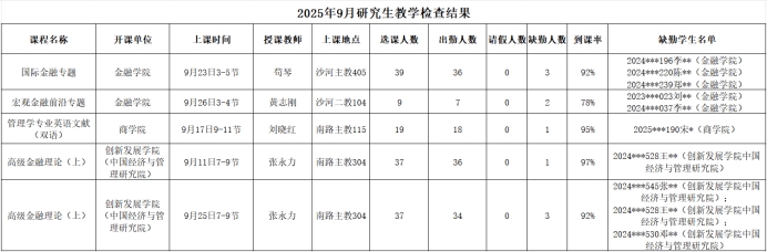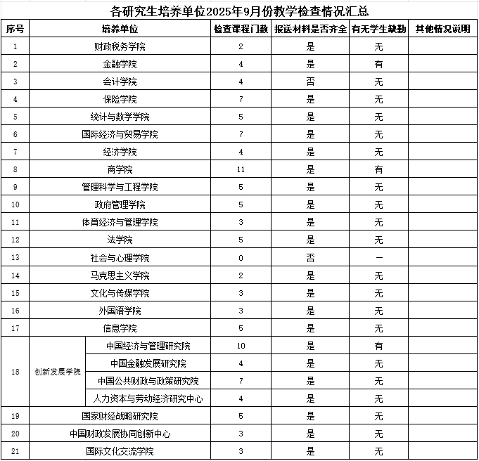 现将2025年9月份各单位上报教学检查及缺勤情况进行通报: